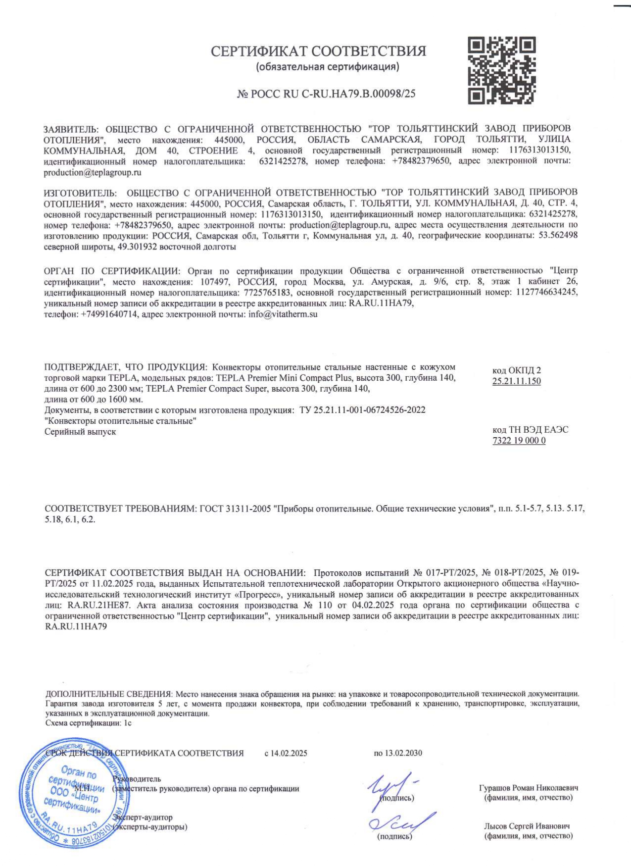 Обязательные сертификаты на конвекторы Tepla